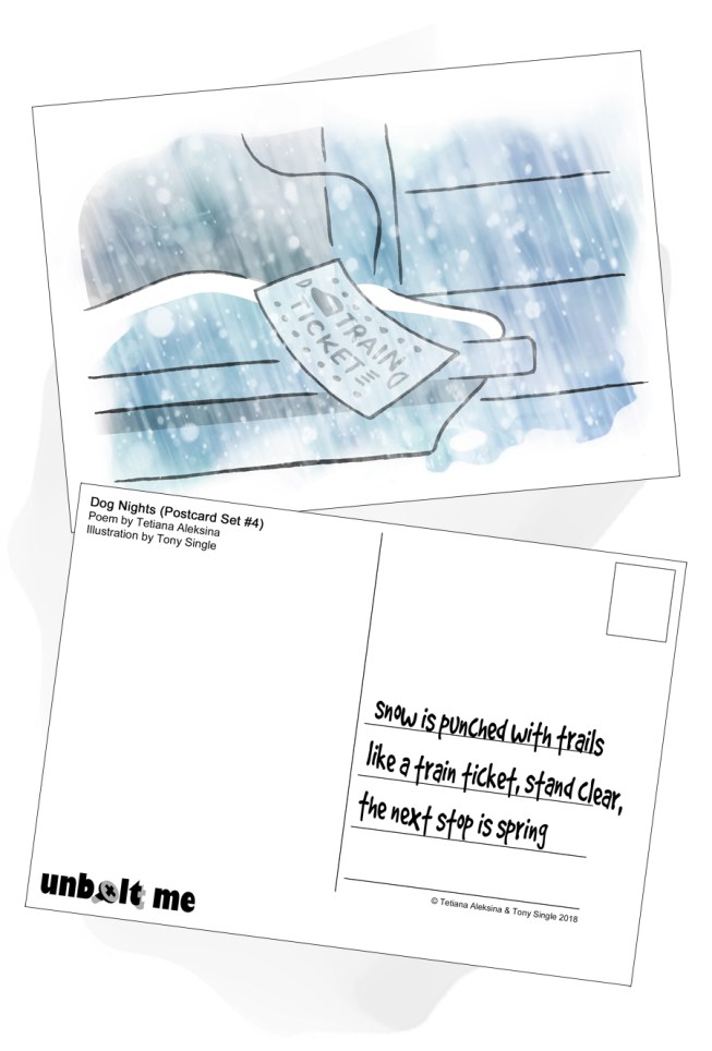 Dog Nights (Postcard Set #4) by TETIANA ALEKSINA & TONY SINGLE © All rights reserved 2018 Rate this:Share this:Tweet Click to share on Telegram (Opens in new window) Telegram MoreShare on Tumblr Click to share on Reddit (Opens in new window) Reddit Click to share on WhatsApp (Opens in new window) WhatsApp Pocket Click to email a link to a friend (Opens in new window) Email Click to print (Opens in new window) Print Like Loading... Related